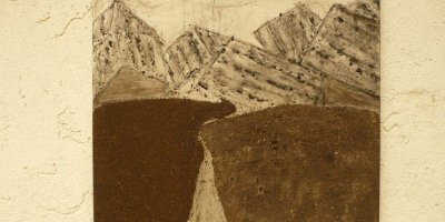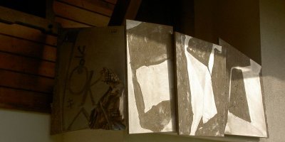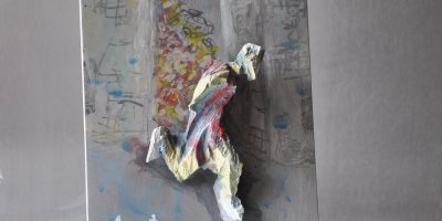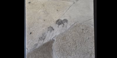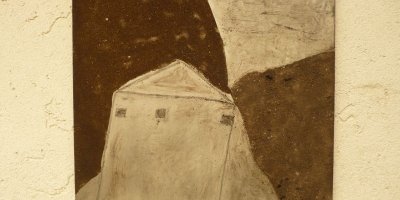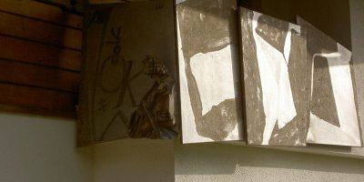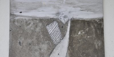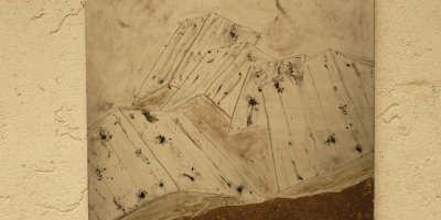 Balkonartiges Gesims, Asche, Kohle auf Aluminium, Holz. Bezugnehmend auf den Beruf des Hausbestitzers-Ziviltechniker-lehnt sich das Thema an Mappenblätter, bzw. der Person des Ptolemäus an.