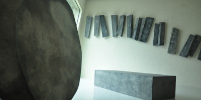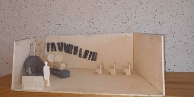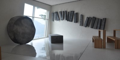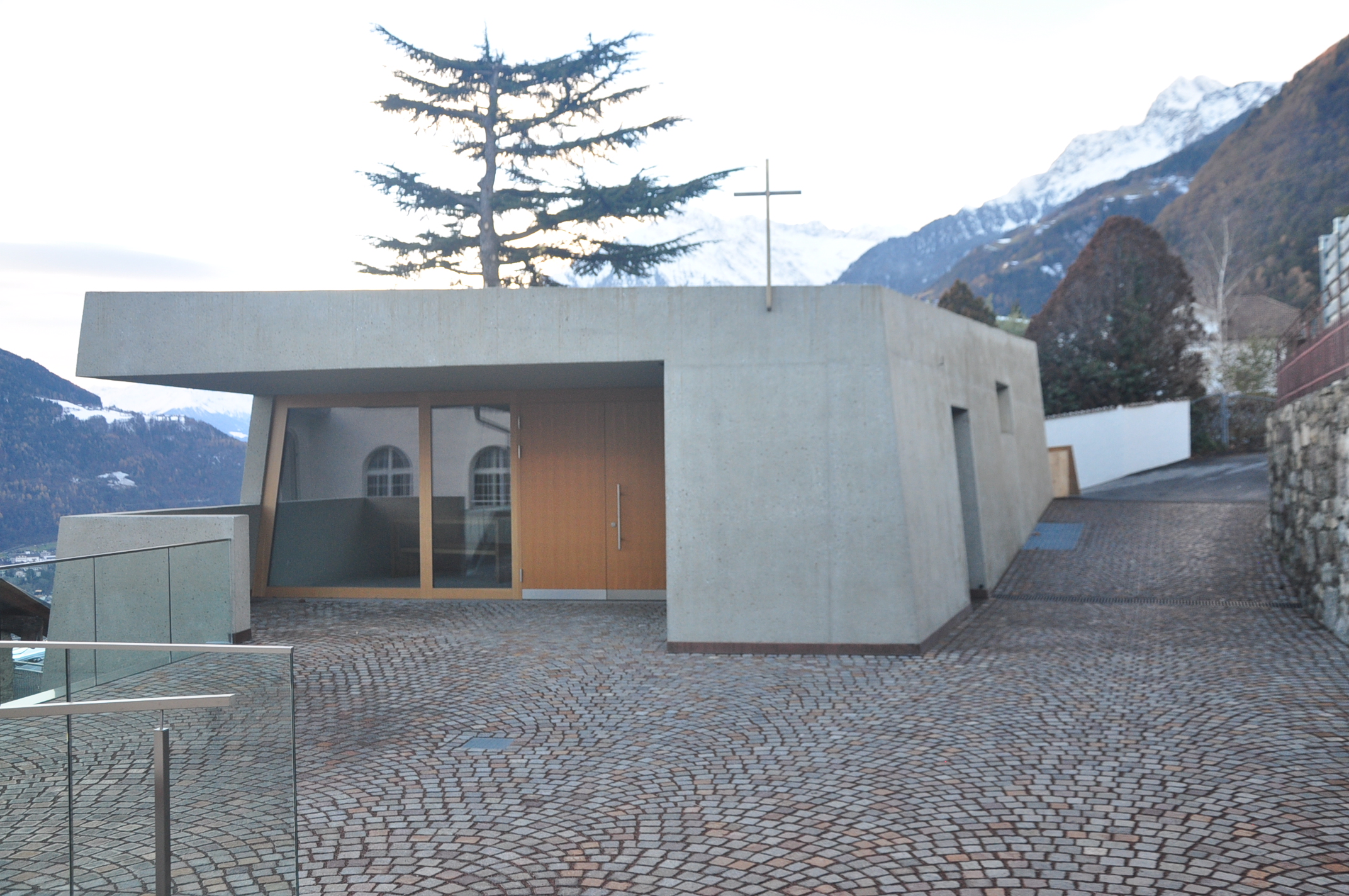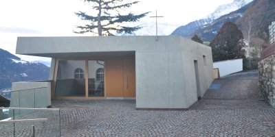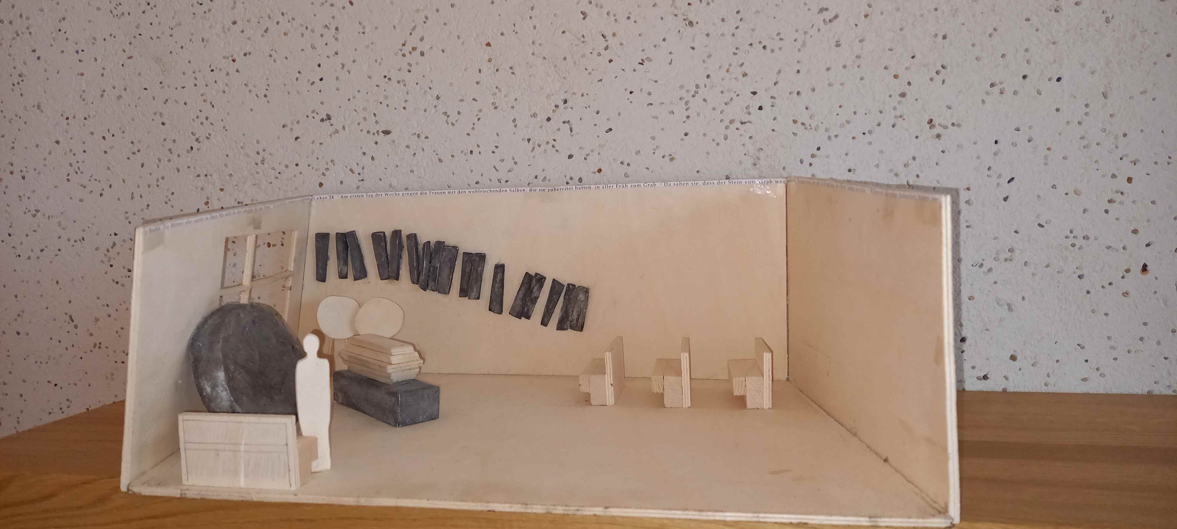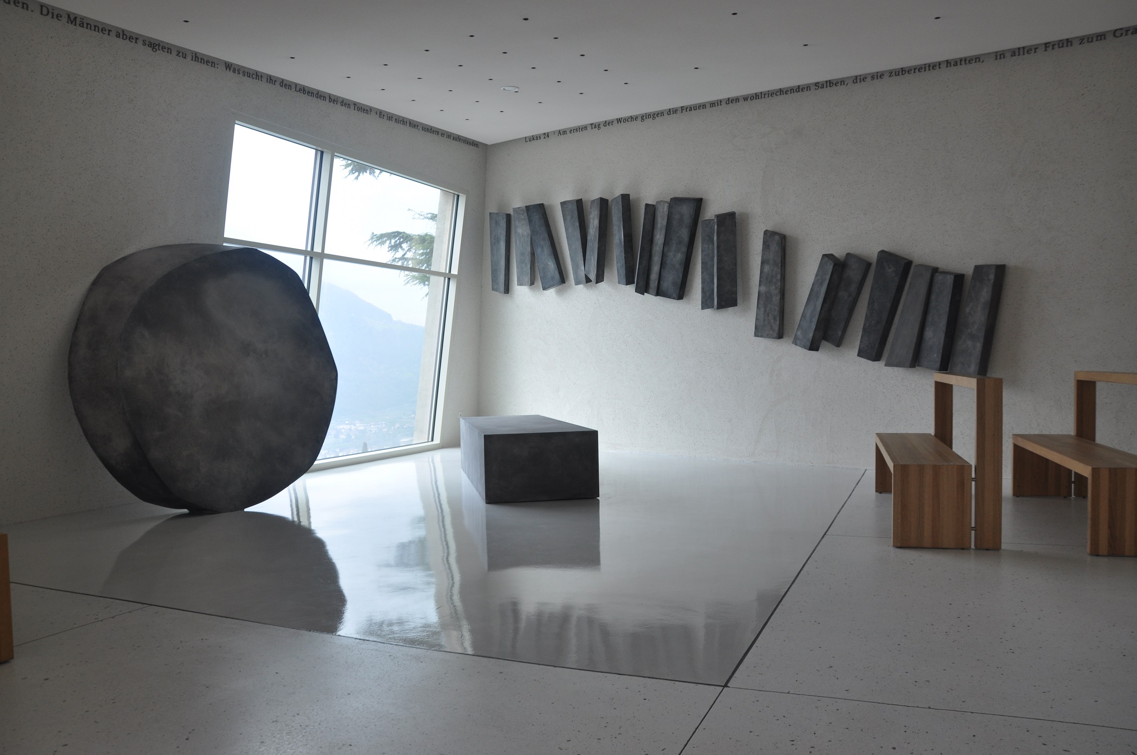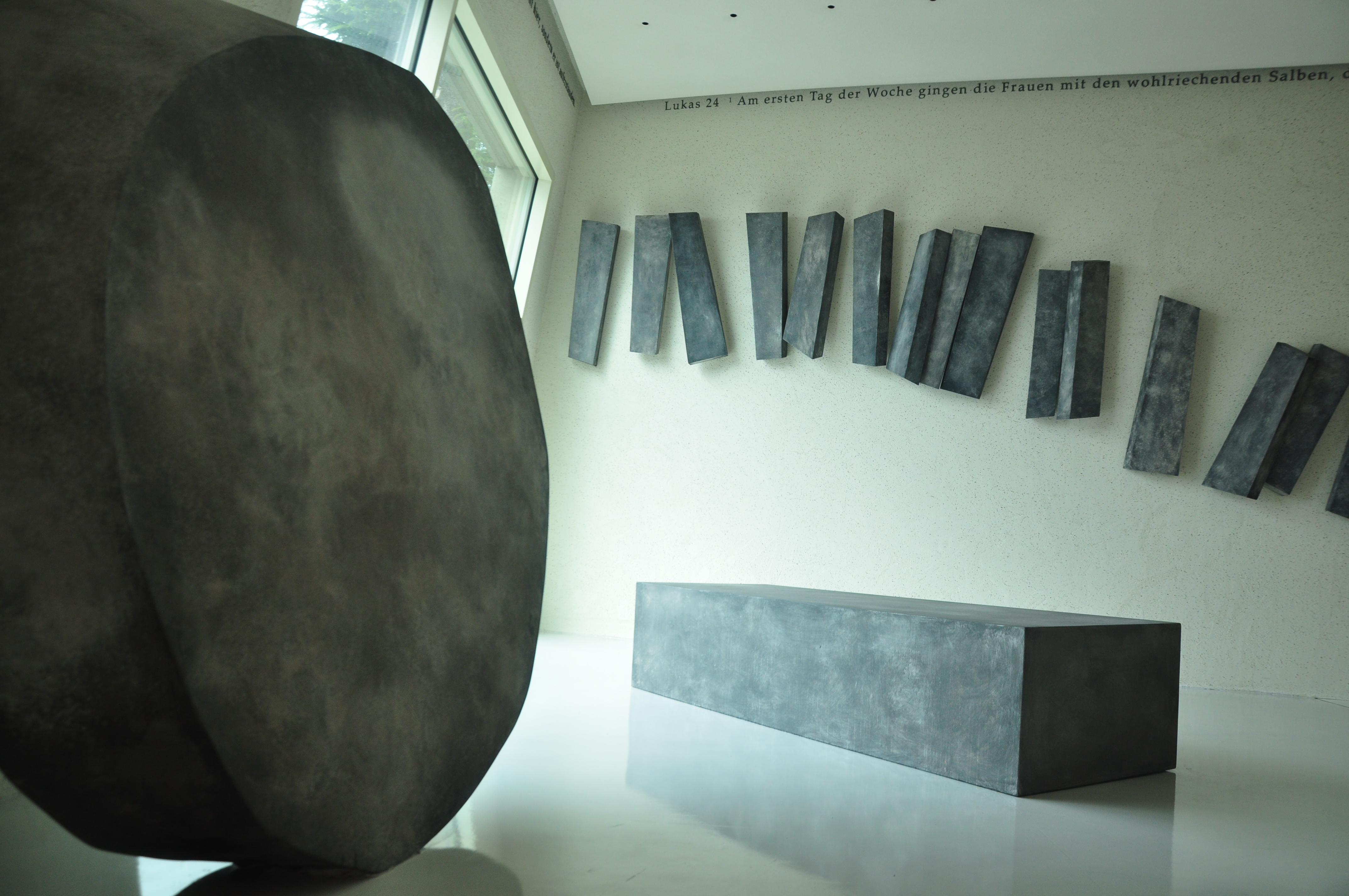 An der Frontseite des Aufbahrungsraumes führt eine Stiege in die Grabkammer. Jede Stufe ist anders, die Abstände unterschiedlich, ebenso die Winkel zueinander; bis zur Schnittstelle, an dem sich das irdische in ein anderes Leben wandelt. Der Stein ist weggerollt - das Grab ist leer. Eingerahmt vom Kern der Botschaft, dem Evangelium nach Lukas.
