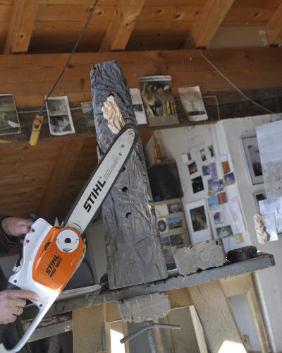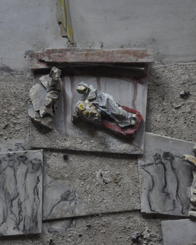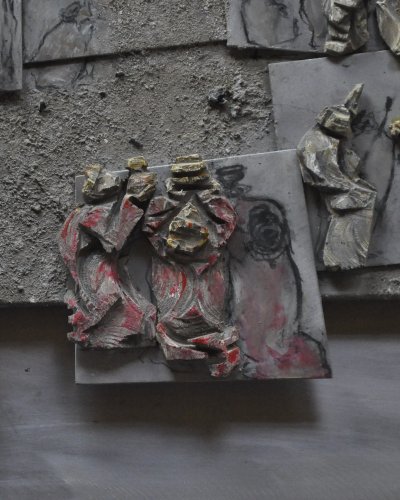Reliefarbeit - Kippenfiguren aus Holz, 100% Kettensägearbeit, gefasst, Asche, Kohle auf Aluminium appliziert, 99 x 68 x 6 cm