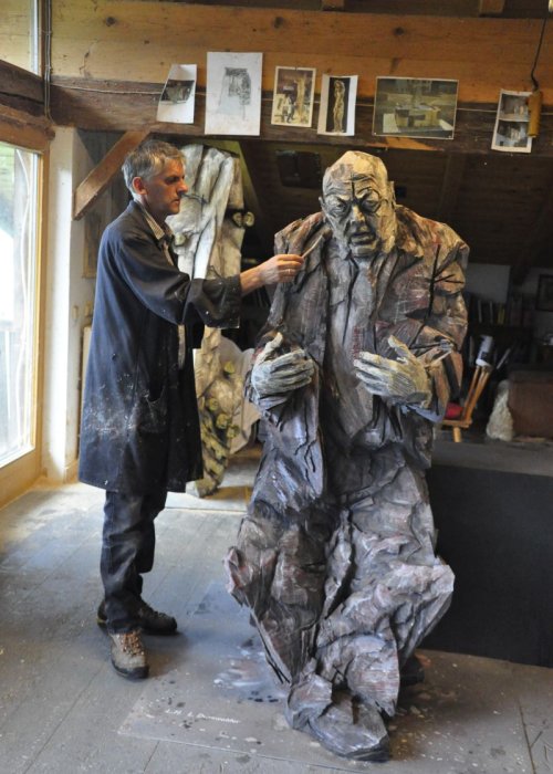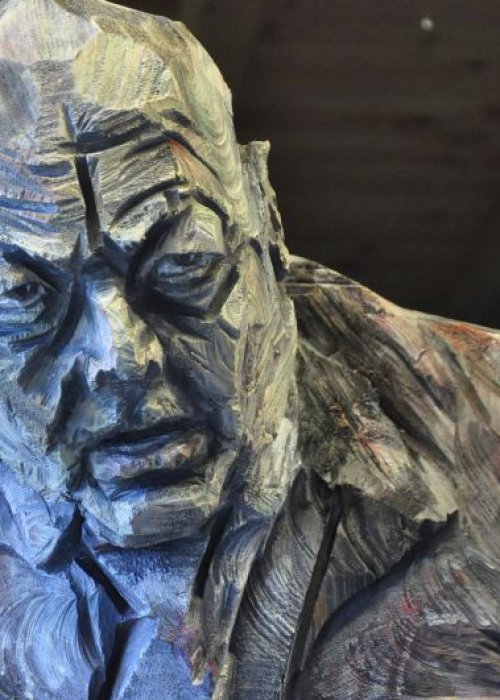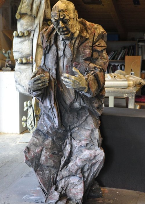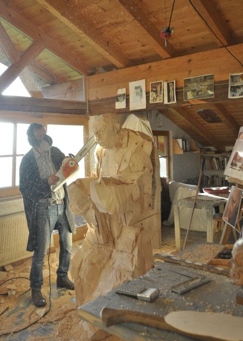 Auftrag von Reinhold Messner. In Holz, Kettensägetechnik, gefasst, überlebensgroß.