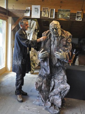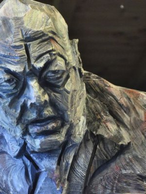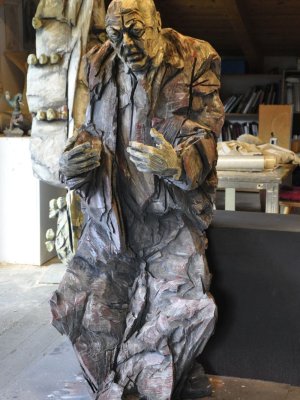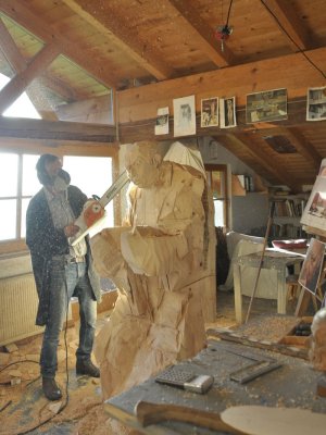 Im Auftrag von Reinhold Messner. In Holz, Kettensägetechnik, gefasst, überlebensgroß.