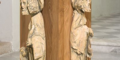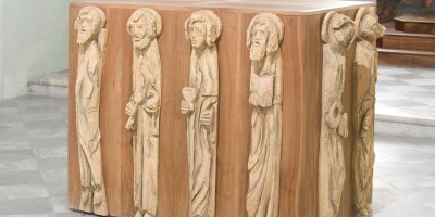 Apostle altar and Ambo. Corpus in walnut wood, scultures in maple.